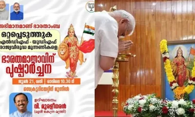 തിരുവനന്തപുരം: ത്രിവർണ പതാകയേന്തിയ ഭാരതാംബയുടെ ചിത്രവുമായി ബിജെപി സംസ്ഥാന ഘടകം. സെക്രട്ടേറിയറ്റിന് മുന്നിൽ ഇന്നുരാവിലത്തെ പരിപാടിക്കായി തയ്യാറാക്കിയ പോസ്റ്ററിലാണ് ത്രിവർണ പതാകയേന്തിയ ഭാരതാംബയുടെ ചിത്രം പ്രത്യക്ഷപ്പെട്ടത്. പാർട്ടി സംസ്ഥാന ഘടകത്തിന്റെ ഔദ്യോഗിക ഫേസ്ബുക്ക് പേജിലാണ് ചിത്രമടങ്ങിയ...