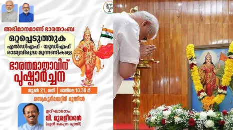 ത്രിവർണ പതാകയേന്തിയ ഭാരതാംബയുടെ ചിത്രവുമായി ബിജെപി :സർക്കാർ- ഗവർണർ പോര് കനക്കുന്നു